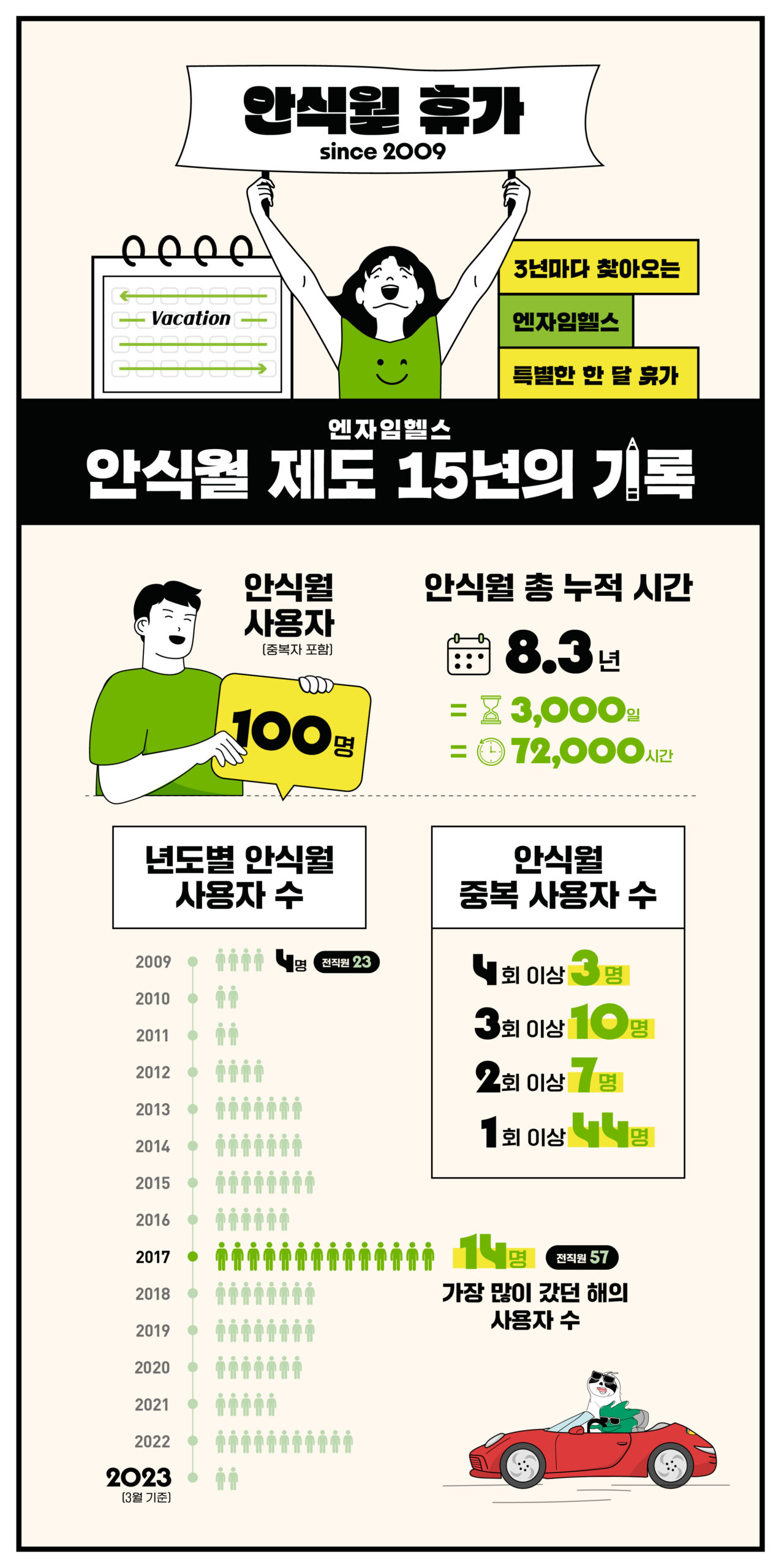 엔자임헬스는 15년간 안식월 휴가 제도를 유지해왔습니다. 드디어 100번째 안식월 휴가자가 탄생하여 이렇게 기록을 남깁니다. 100명의 안식월자가 누린 휴가 기간을 년으로 환산하면 8.3년에 달하는 긴 시간입니다. 6-70명 규모의 컨설팅 조직에서 기본 연차 외에 한 달이나 사무실을 비운다는 것은 쉬운 일이 아니었습니다. 하지만, 직원들의 노력으로 15년 동안 좋은 제도를 유지하고 발전시킬 수 있었습니다. 앞으로도 엔자임헬스는 직원들이 개인적 삶과 회사 업무 간의 균형을 잘 잡아갈 수 있도록 노력을 다할 예정입니다.