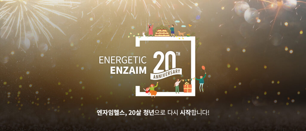 20th Anniv. Energetic Enzaim3월 10일은 엔자임헬스의 20주년 창립기념일 2023년 3월 10일 금요일은 엔자임헬스의 창립 20주년입니다. 건강한 세상을 만들기 위한 노력은 이제부터가 시작입니다. 20세 청년의 마음가짐으로 더욱 에너지 넘치는 활동을 건강하게 이어가겠습니다.