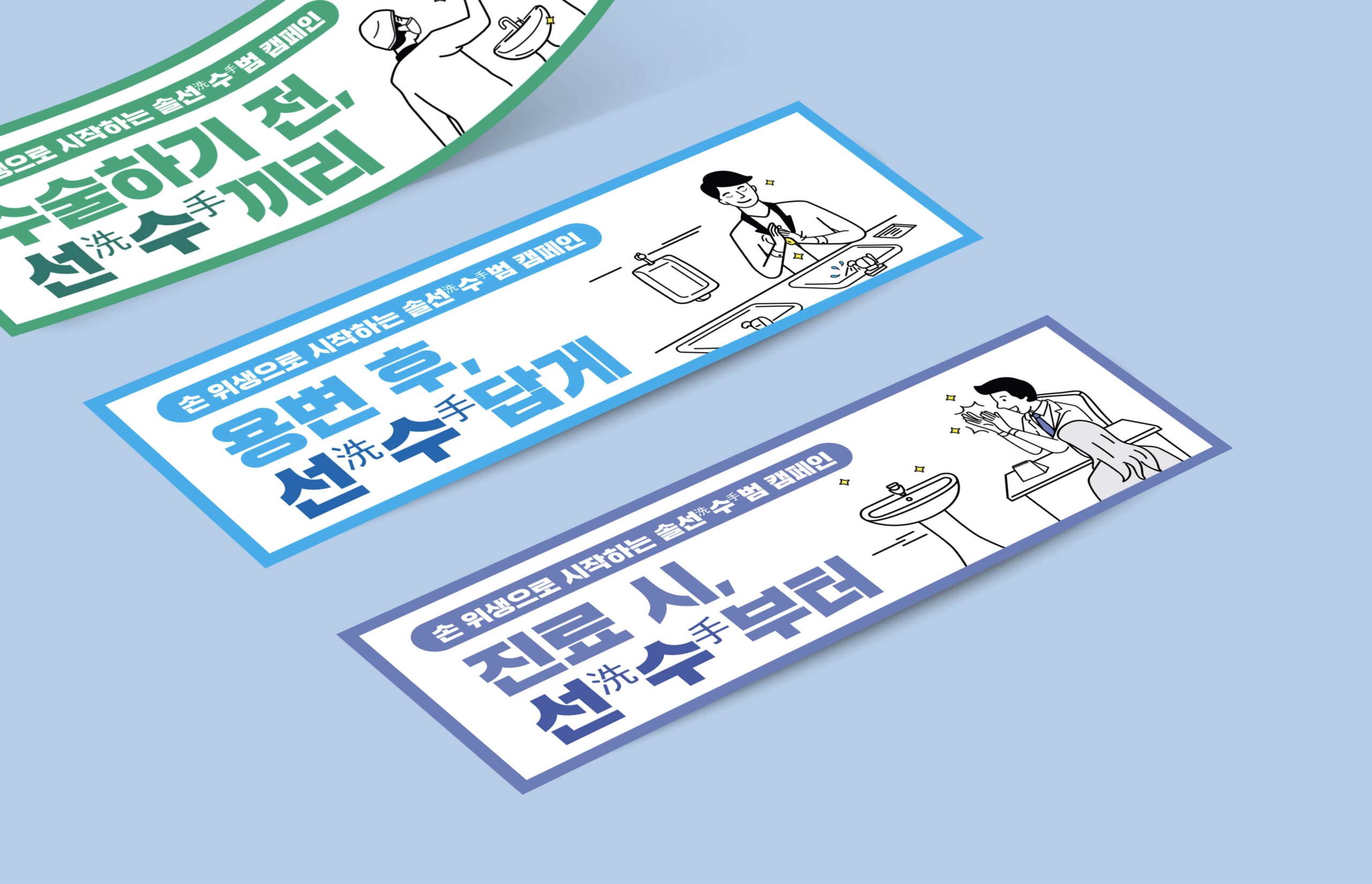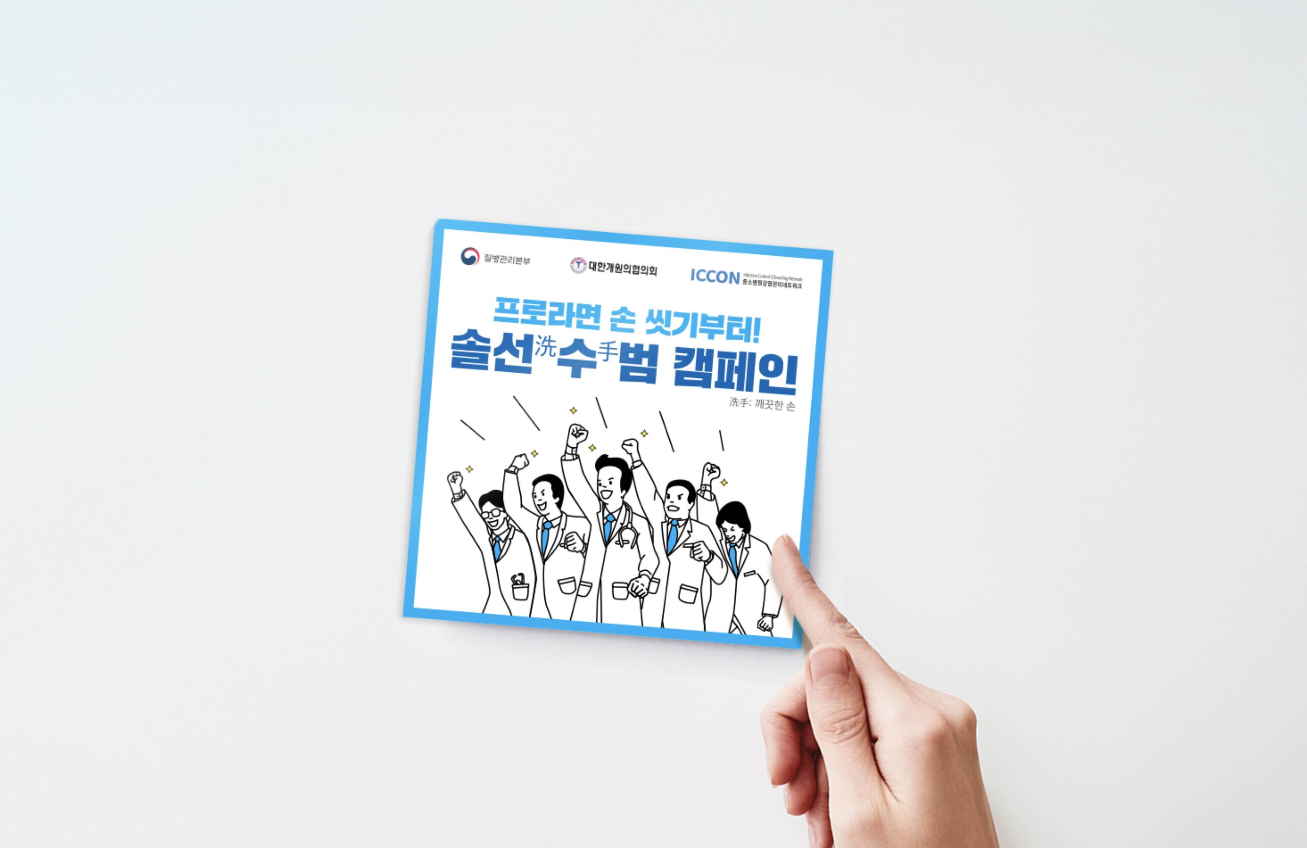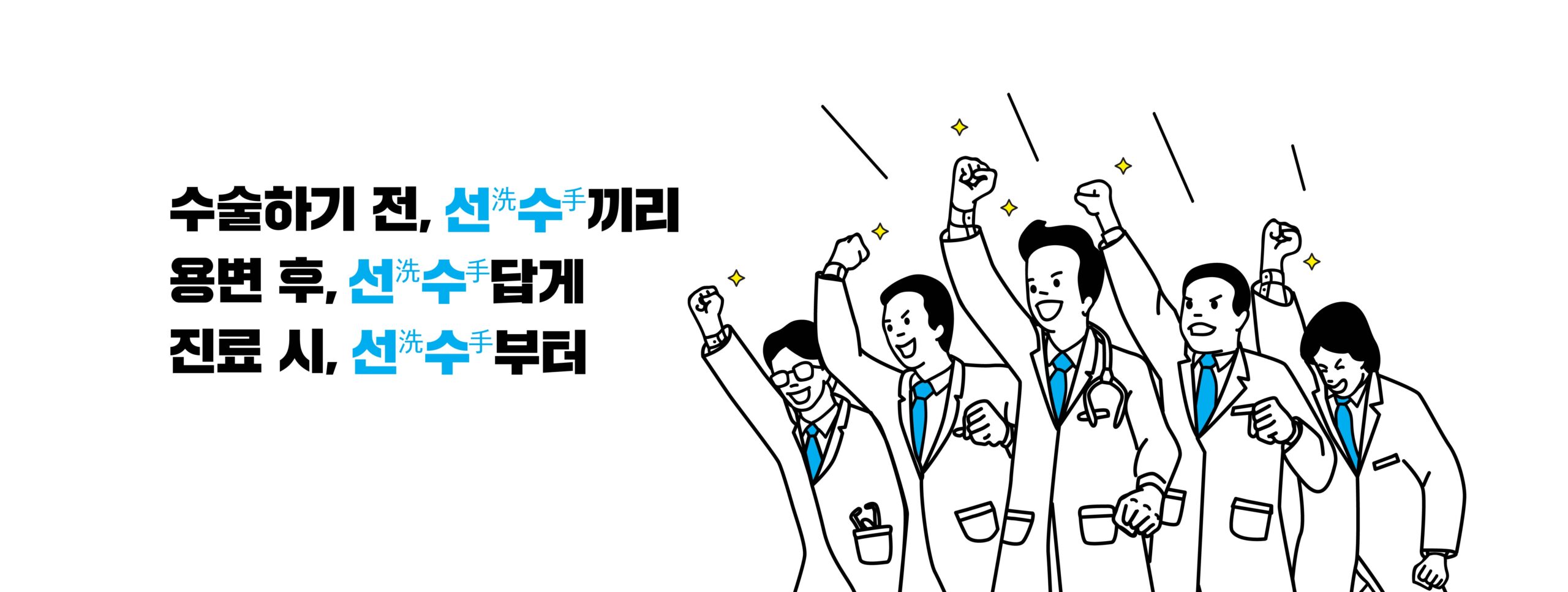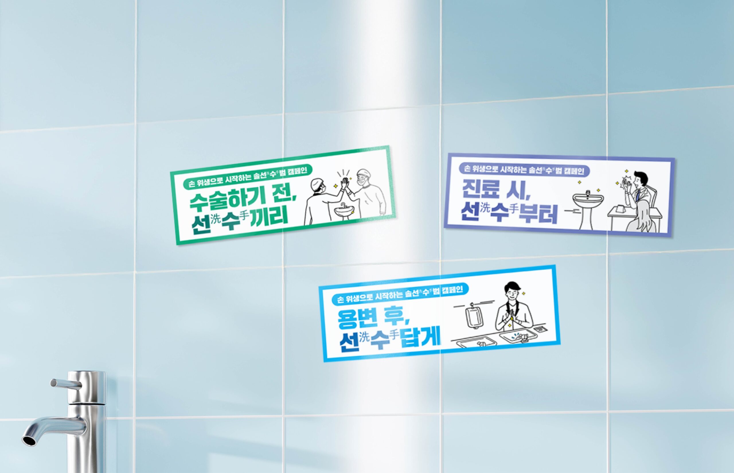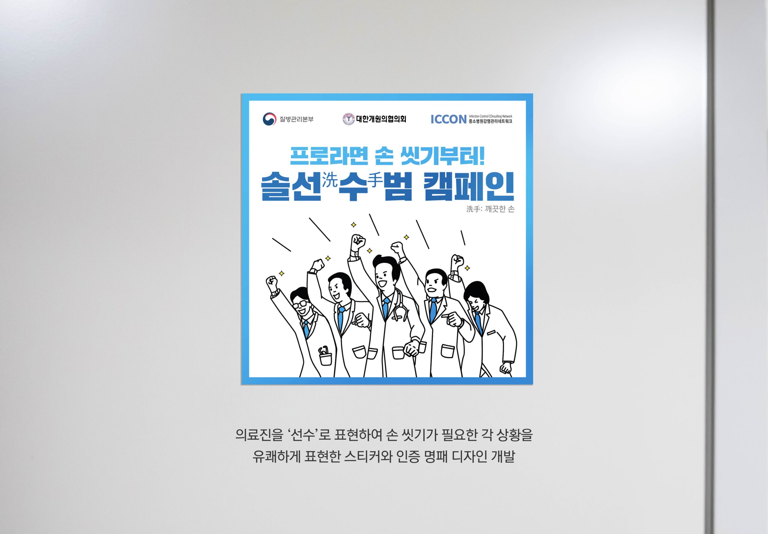 헬스케어 디자인본부는 대한의료관련감염관리학회의 ‘손 위생 캠페인’을 위한 그래픽 디자인을 진행했습니다. ‘깨끗한 손’의 의미를 담아 ‘솔선(洗)수(手)범 캠페인’을 기획하게 되었습니다. 의료진을 ‘선수’로 표현하여 손 씻기가 필요한 각 상황을 유쾌하게 표현한 스티커와 인증 명패 만들어 감염 관리를 즐겁고 재미있게 진행하도록 커뮤니케이션 했습니다.