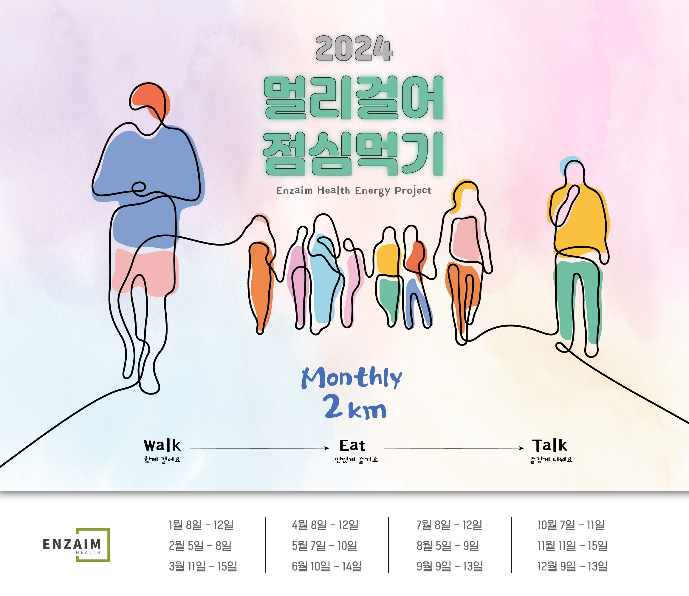 올해도 어김없이 엔자임헬스의 에너지 프로젝트는 계속됩니다. 엔자임헬스의 여러 복지 프로그램 중 Top 3에 랭크되는 인기 만점의 행사입니다. 올해도 ‘멀리걸어 점심먹기’를 통해 임직원들의 육체적인 건강은 정신적인 여유까지 제공하기 위해 노력할 예정입니다. 멀.걸.점. 주간이 아니더라도 틈틈이 걷고 본부원과 함께 의미 있는 시간 자주 나누시길 기원합니다.