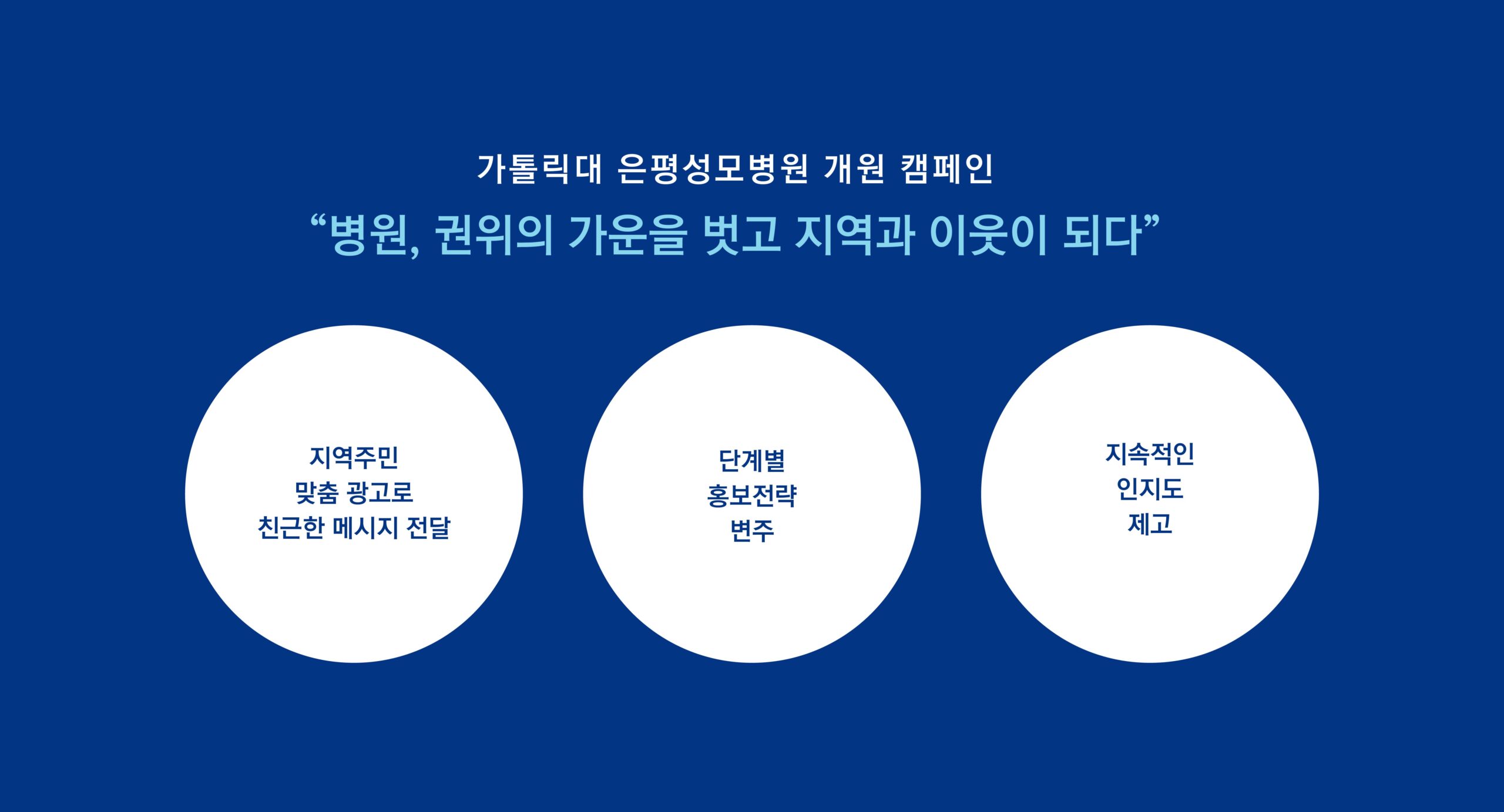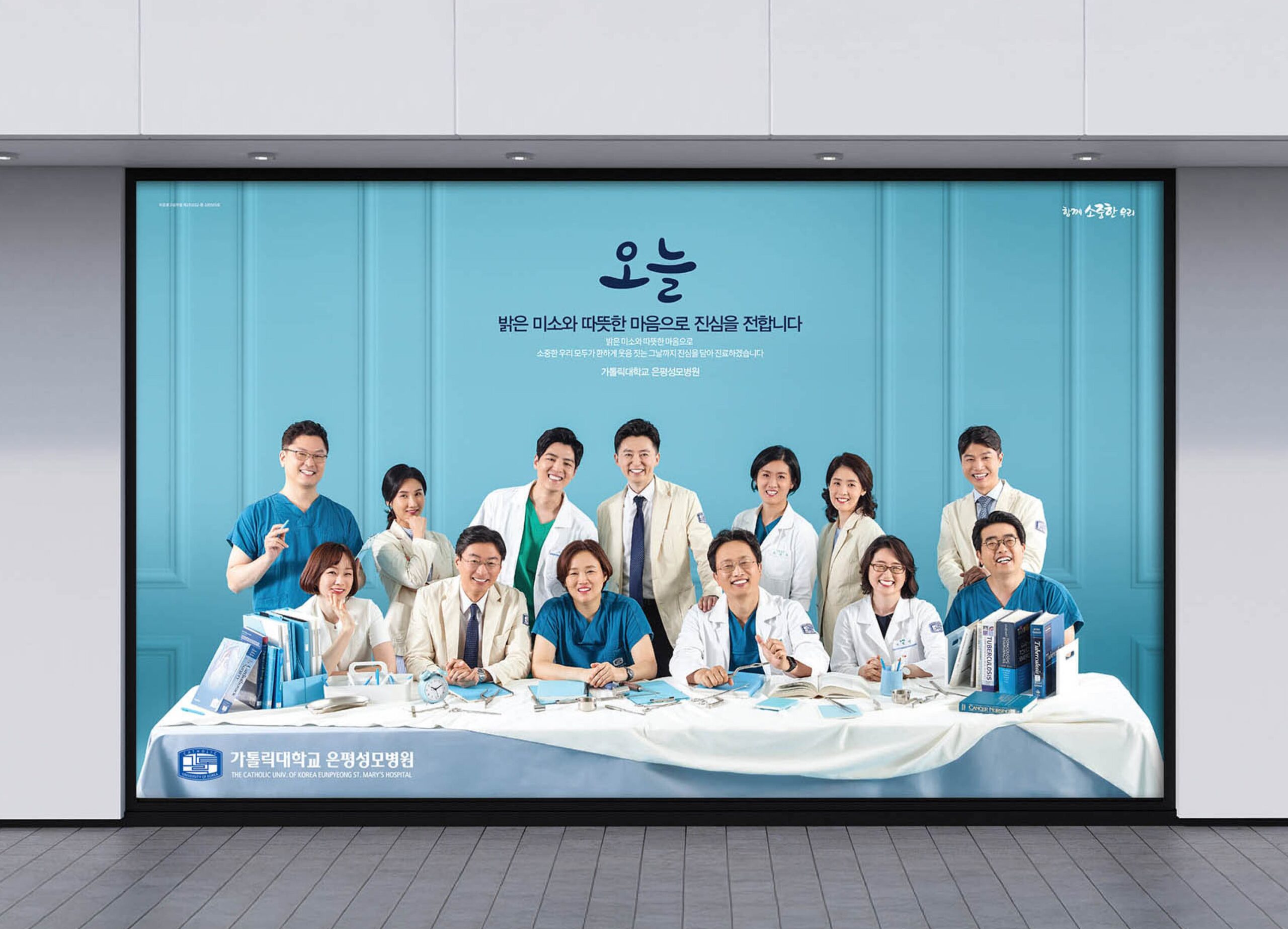 종합병원, 권위의 가운을 벗다! 헬스케어 마케팅 본부와 디자인 본부는 전형적인 병원 홍보의 틀에서 나아가 새로운 방식의 개원 광고·홍보 캠페인을 진행했습니다. 해당 지역주민에게 종합병원 개원에 대한 기대감 조성하는 동시에 효과적 인지도를 극대화하는데 초점을 맞췄습니다. 은평성모병원은 개원 후 일 외래환자 3천명 돌파, 808개 전 병상 조기 가동을 하는 등 지역 주민들의 많은 사랑과 관심을 받는데 성공했습니다.