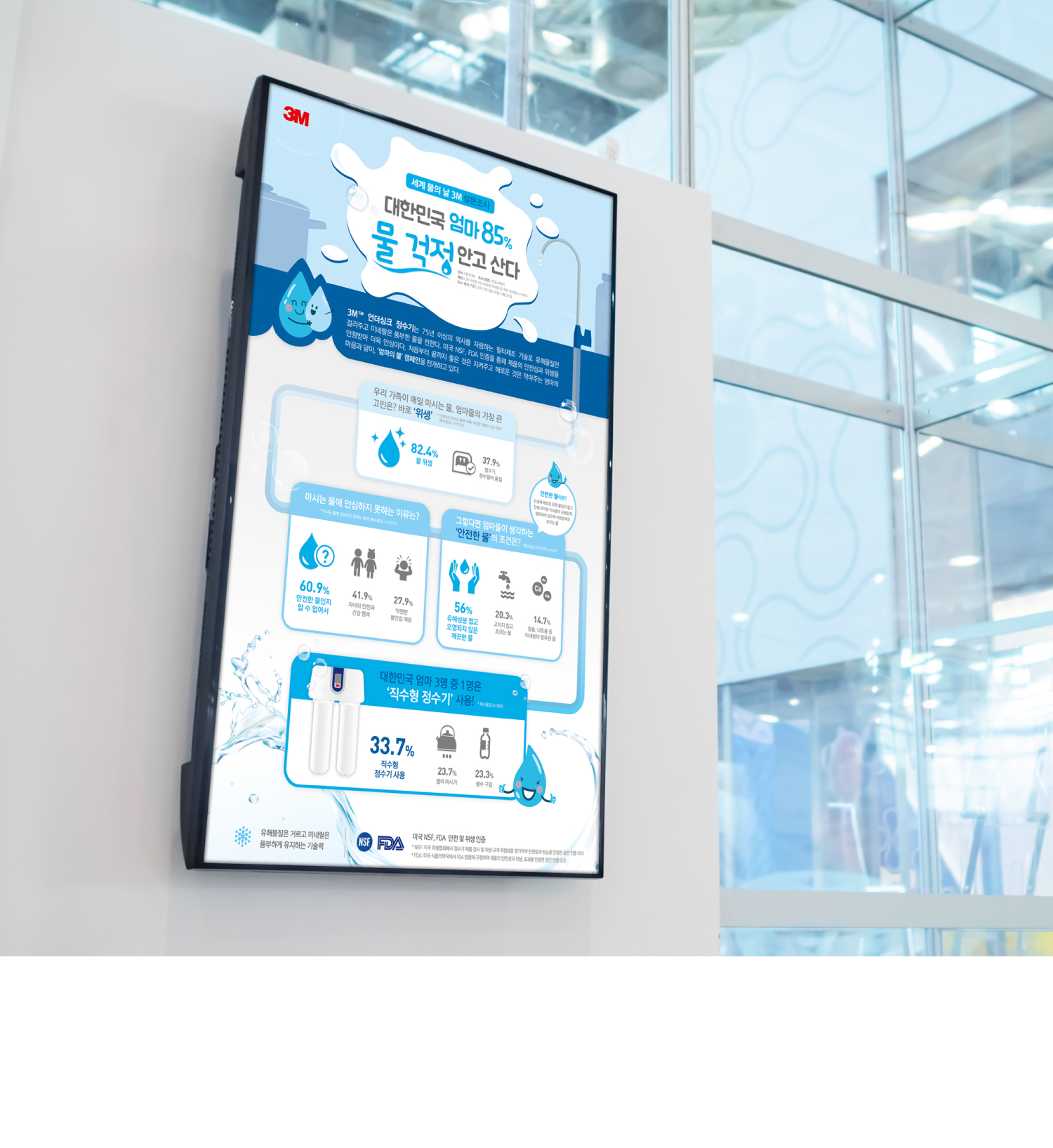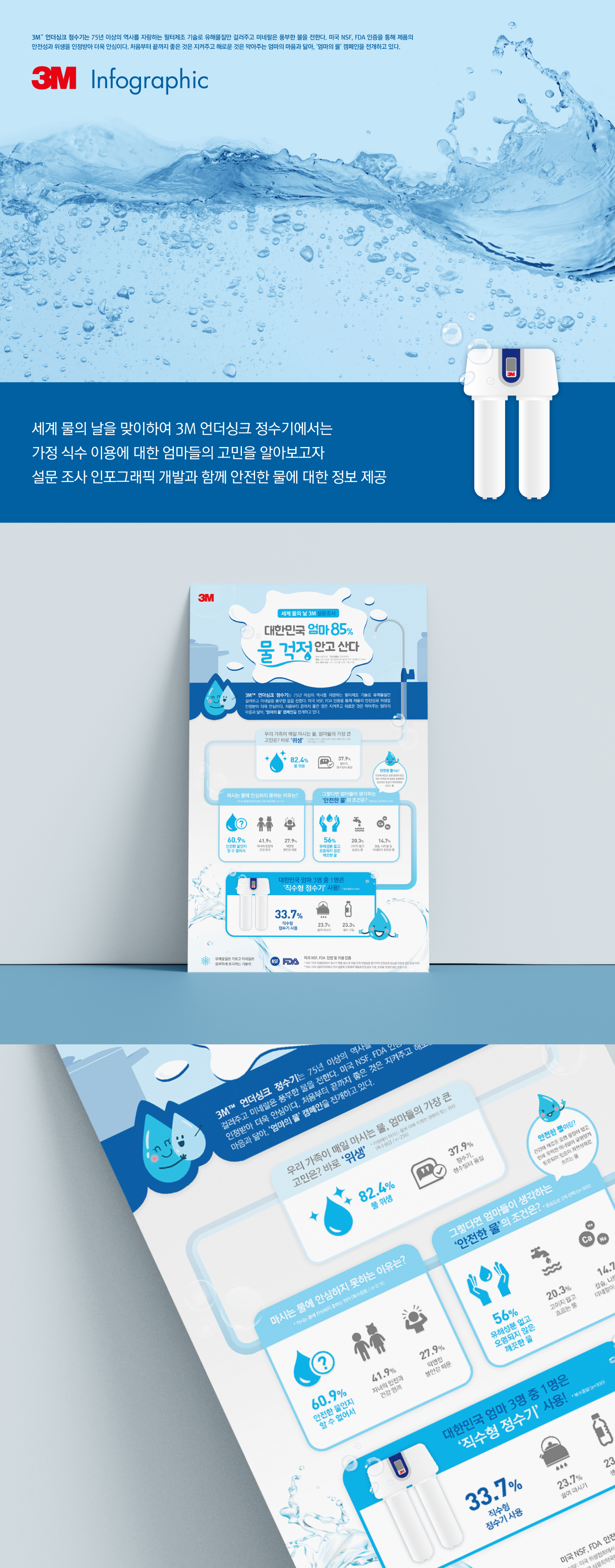 한국3M은 세계 물의 날을 맞이하여 가정 식수 이용에 대한 엄마들의 고민을 알아보고자 설문 조사를 진행했습니다. 30-40대 주부 300명이 느끼는 우리나라 엄마들의 물 안전 인식 결과가 도출되었고, 이를 헬스케어 디자인 본부가 인포그래픽으로 개발하여 안전한 물에 대한 정보 제공하는데 일조했습니다.