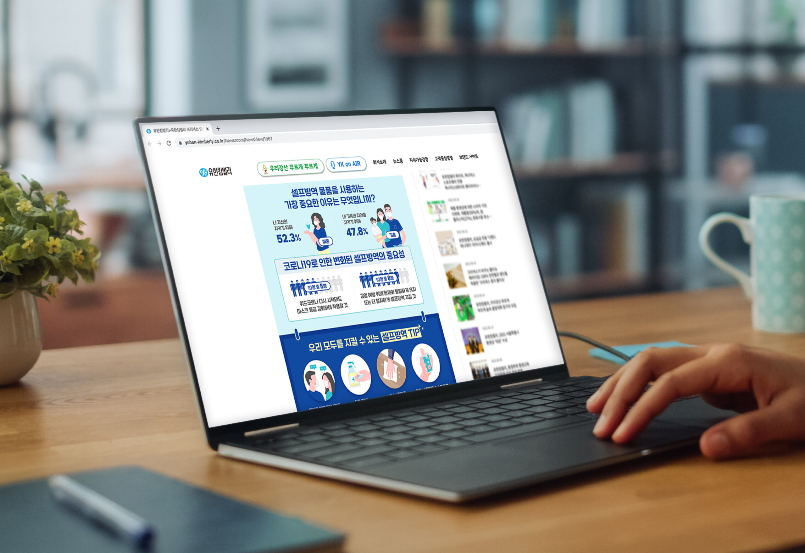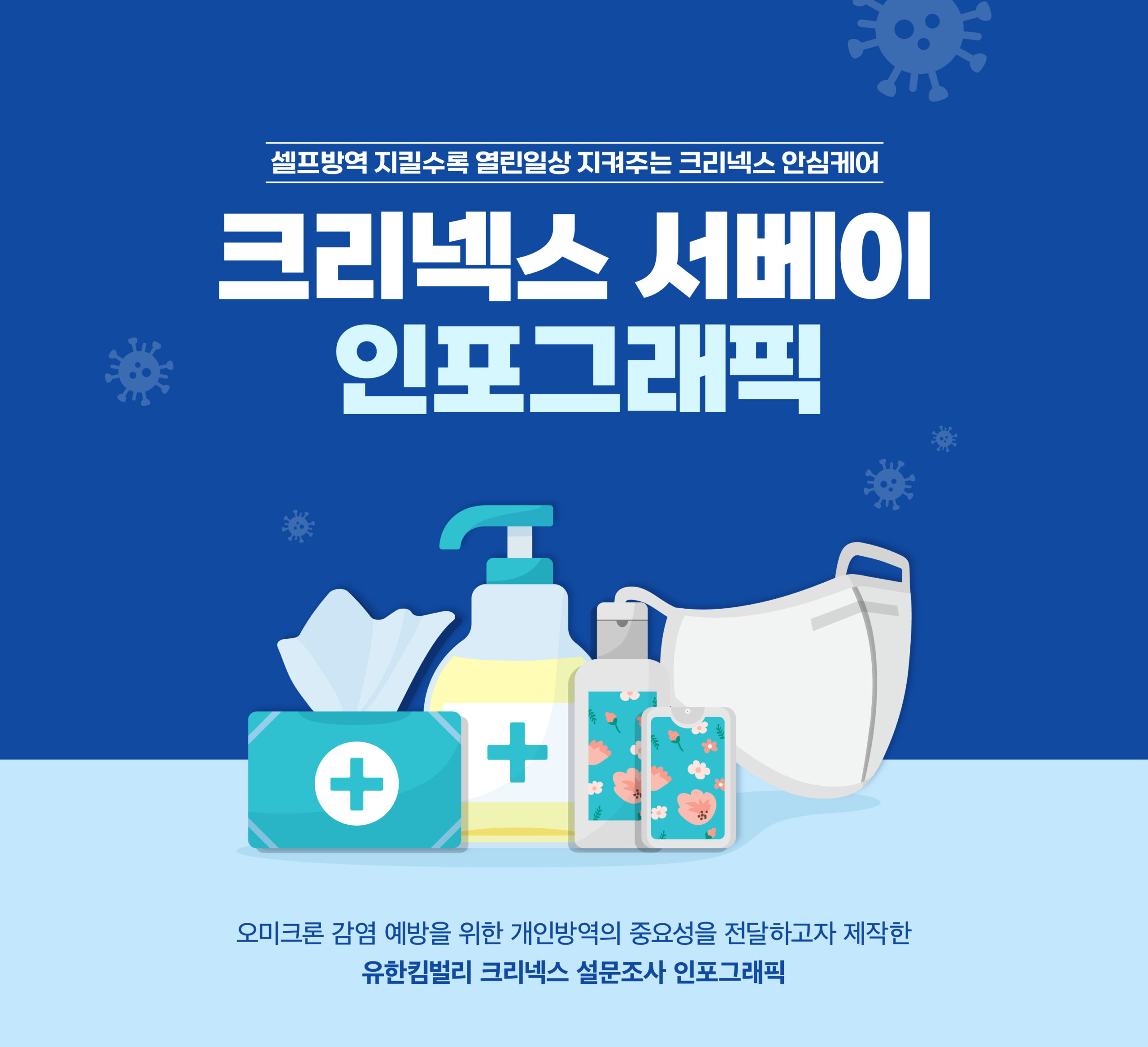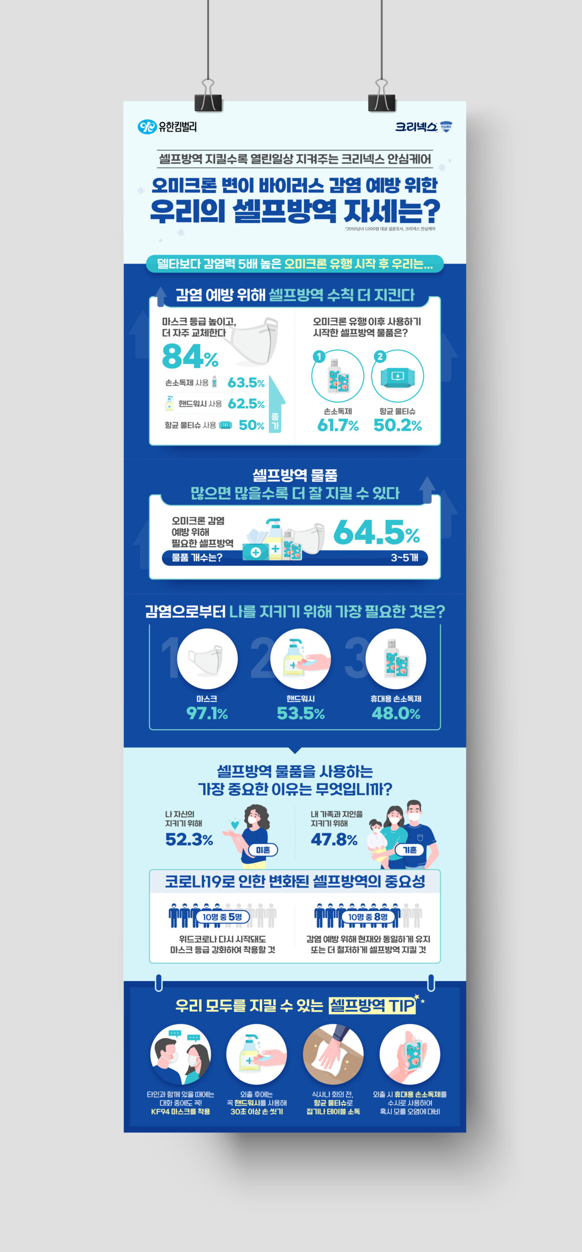 유한킴벌리는 마스크, 손소독제(겔, 스프레이 타입), 손소독티슈, 핸드워시 등 크리넥스 안심케어 라인을 통해 코로나19 시기에 다양한 개인방역 옵션을 제공하고 있습니다. 엔자임헬스는 코로나19 감염 예방을 위한 개인방역의 중요성을 전달하고자 관련 인식조사를 실행하고, 결과에 대한 인포그래픽을 제작∙배포했습니다.