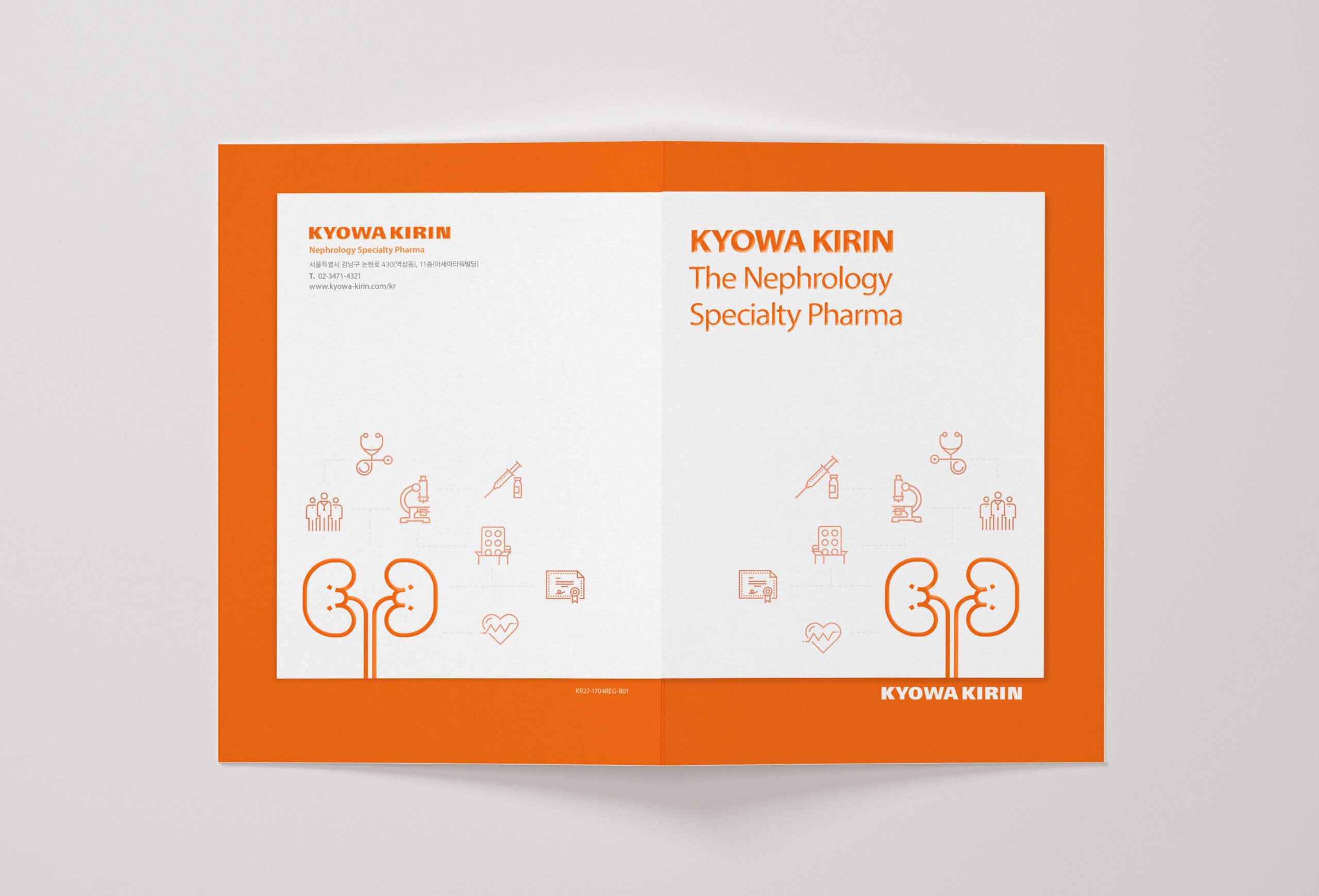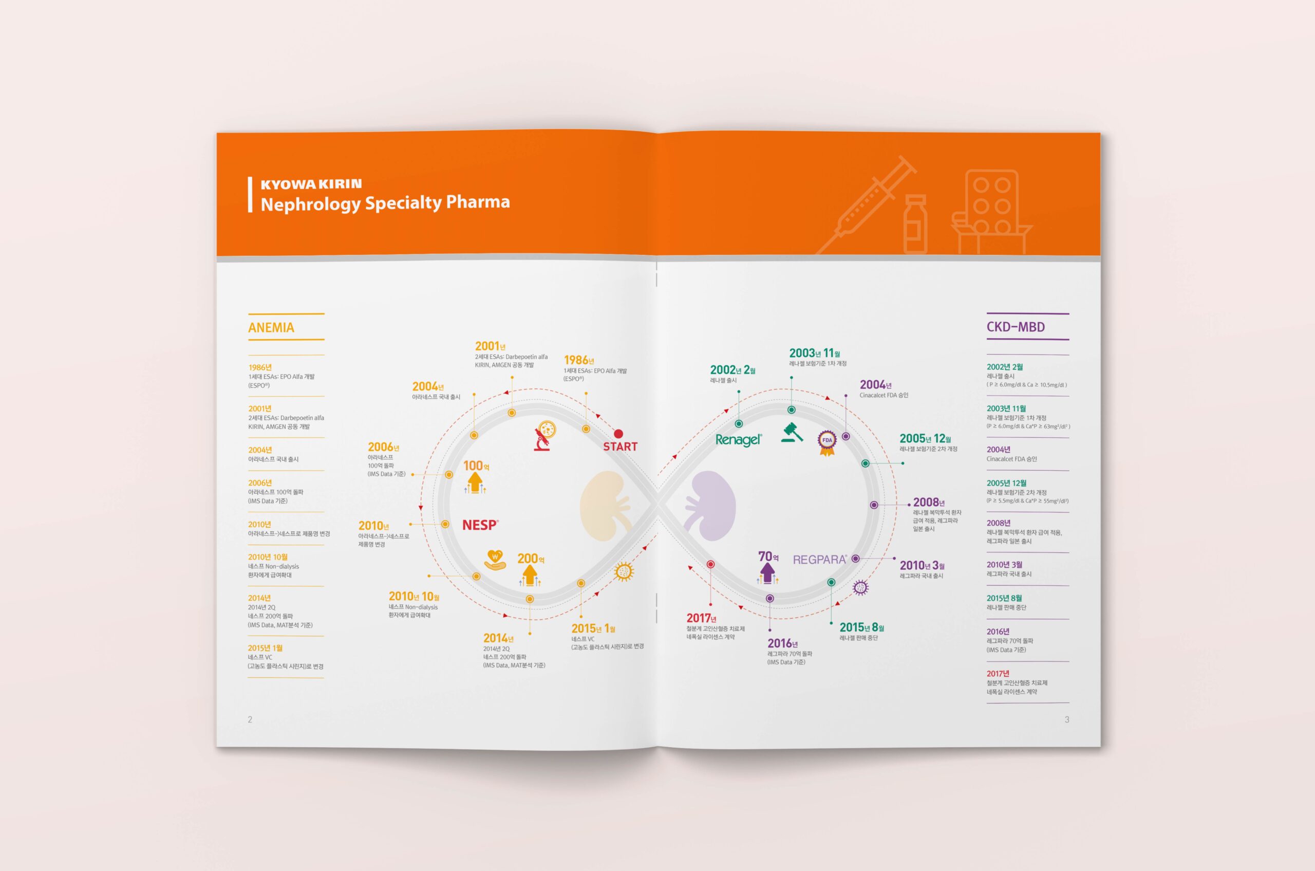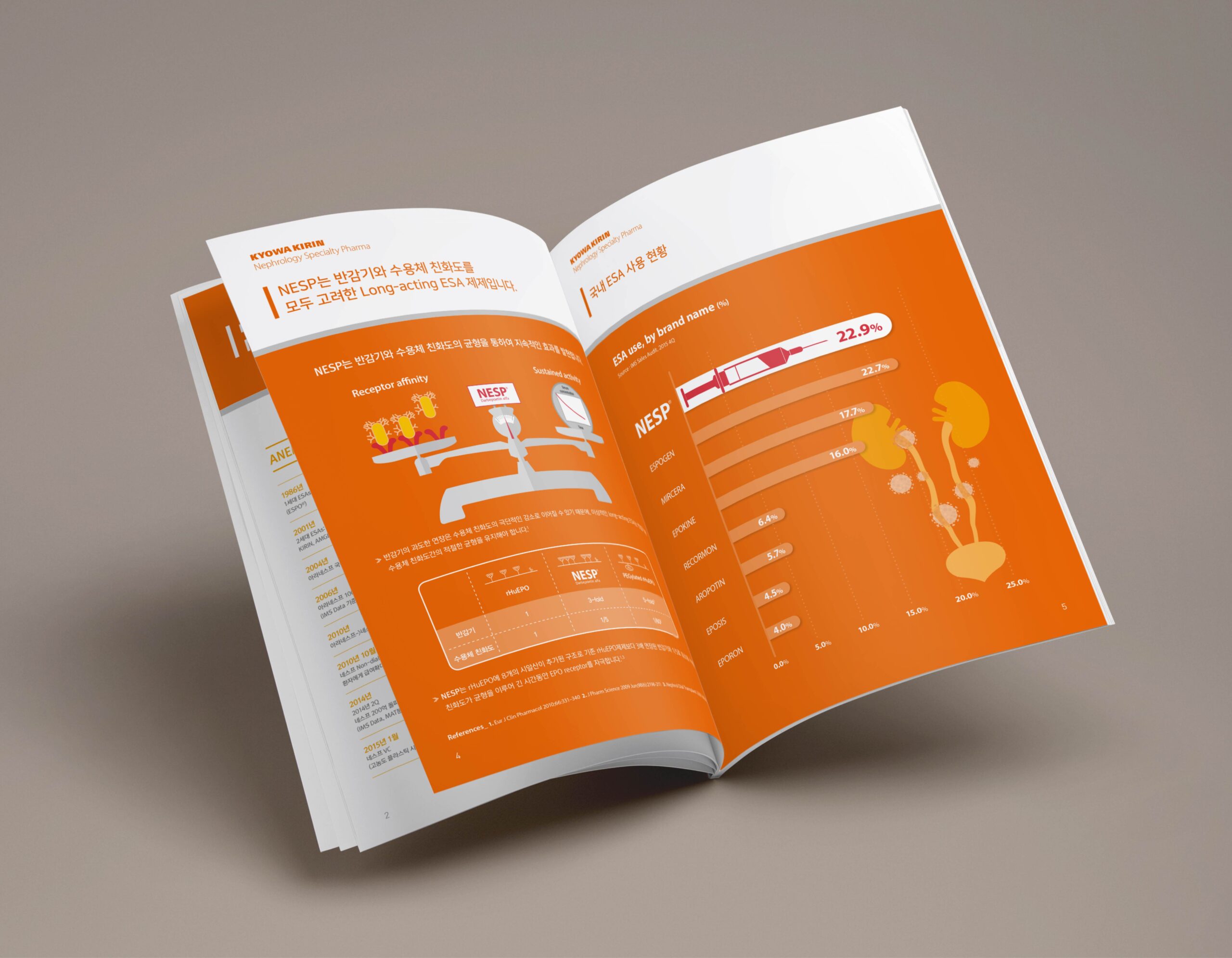 헬스케어 디자인 본부는 신장 및 혈액 종양 영역에 특화된 다국적 제약사인 한국쿄와하코기린을 위해 메디컬 전문가용 브로셔를 제작했습니다. 본 브로셔는 한국쿄와하코기린의 네스프, 레그파라 제품의 효과를 소개하는 의료인용 브로셔입니다. 기업의 키컬러인 오렌지 컬러를 모티브로 삼으면서 제품의 컨셉을 직관적으로 느낄 수 있도록 다양한 픽토그램을 중심으로 커뮤니케이션 하였습니다.