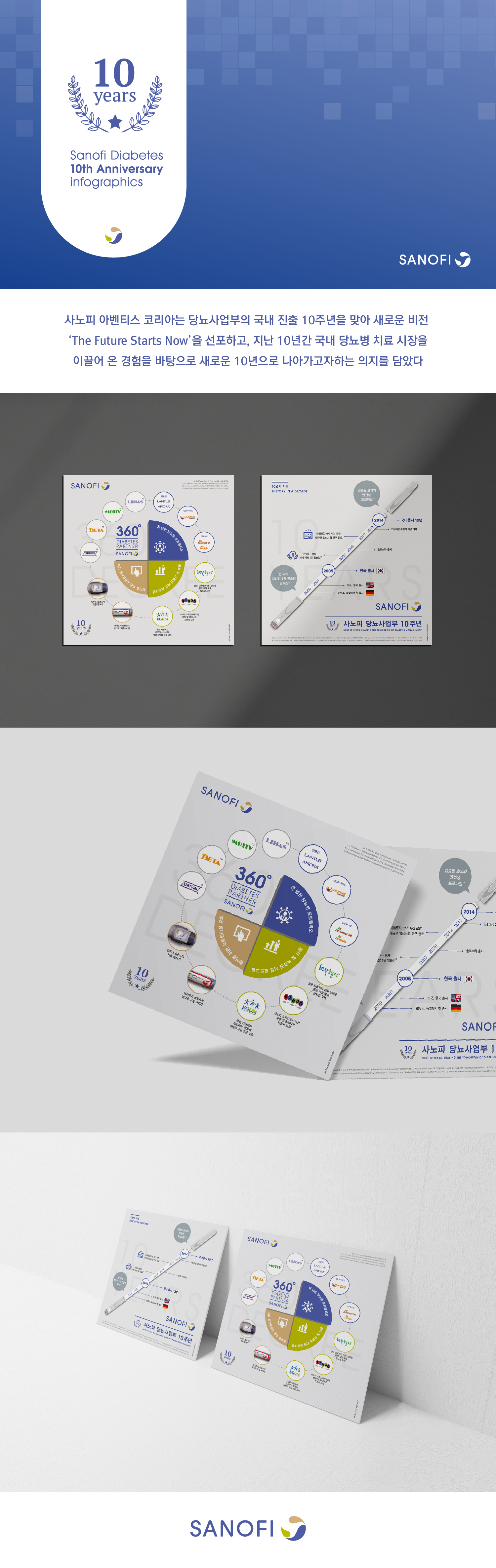 헬스케어 디자인 본부는 사노피 아벤티스 코리아의 당뇨사업부의 국내 진출 10주년을 맞아 선포한 새로운 비전 ‘The Future Starts Now’에 맞춰, 지난 10년간 국내 당뇨병 치료 시장을 이끌어 온 경험을 바탕으로한 인포그래픽을 제작했습니다.