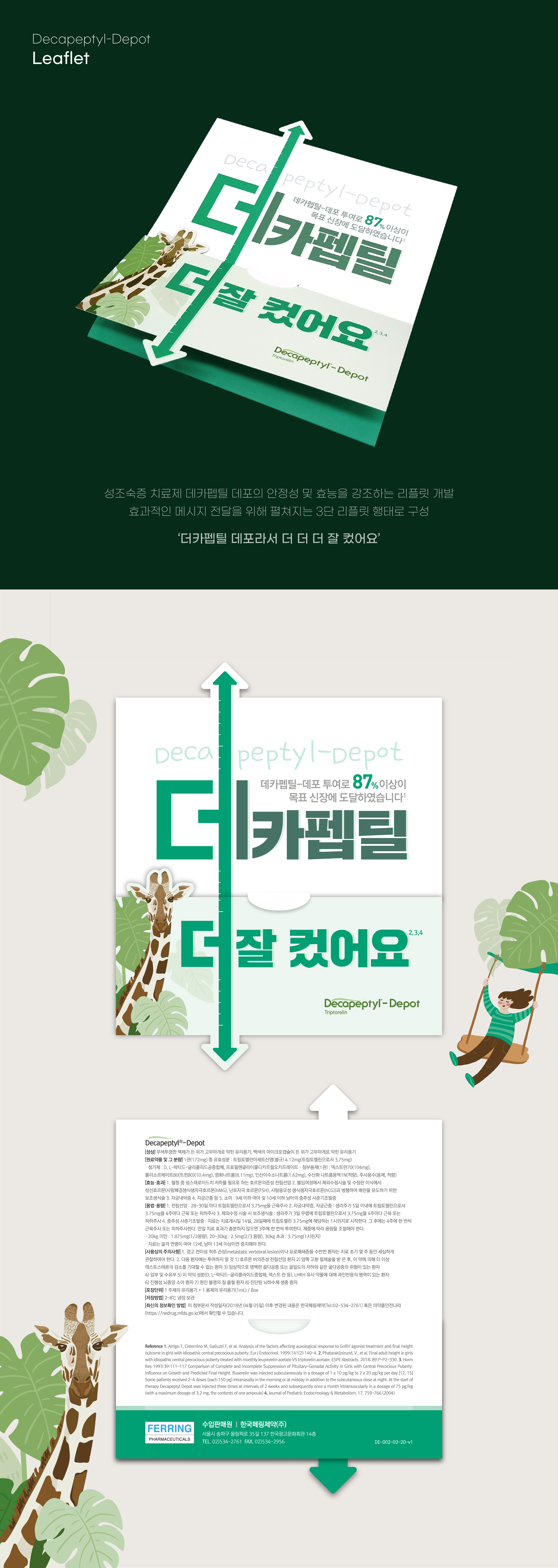 엔자임헬스 디자인 본부에서는 성조숙증 치료제 데카펩틸-데포의 안정성 및 효능을 홍보하는 리플릿을 개발했습니다. ‘데카펩틸 데포로 더 더 더 잘 컸어요’라는 카피라이팅이 돋보이는 작업물을 통해 효과적인 헬스케어 커뮤니케이션에 도움을 주었습니다. 위아래로 펼쳐지는 3단 리플릿으로 독창적인 디자인을 선보입니다.